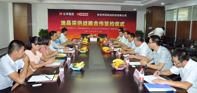9月13日的石羊集團(tuán)總部,秋高氣爽、陽光燦爛,9點(diǎn)30分,經(jīng)過行政部與市場(chǎng)部前期的緊張籌備,油脂事業(yè)部與陜西建興農(nóng)業(yè)科技有限公司、寧夏鋒潤(rùn)糧油有限公司、山東三星玉米科技有限公司及新疆泰昆集團(tuán)股份有限公司四家油企“油品采供戰(zhàn)略合作簽約儀式”在三樓會(huì)議室如期舉行。