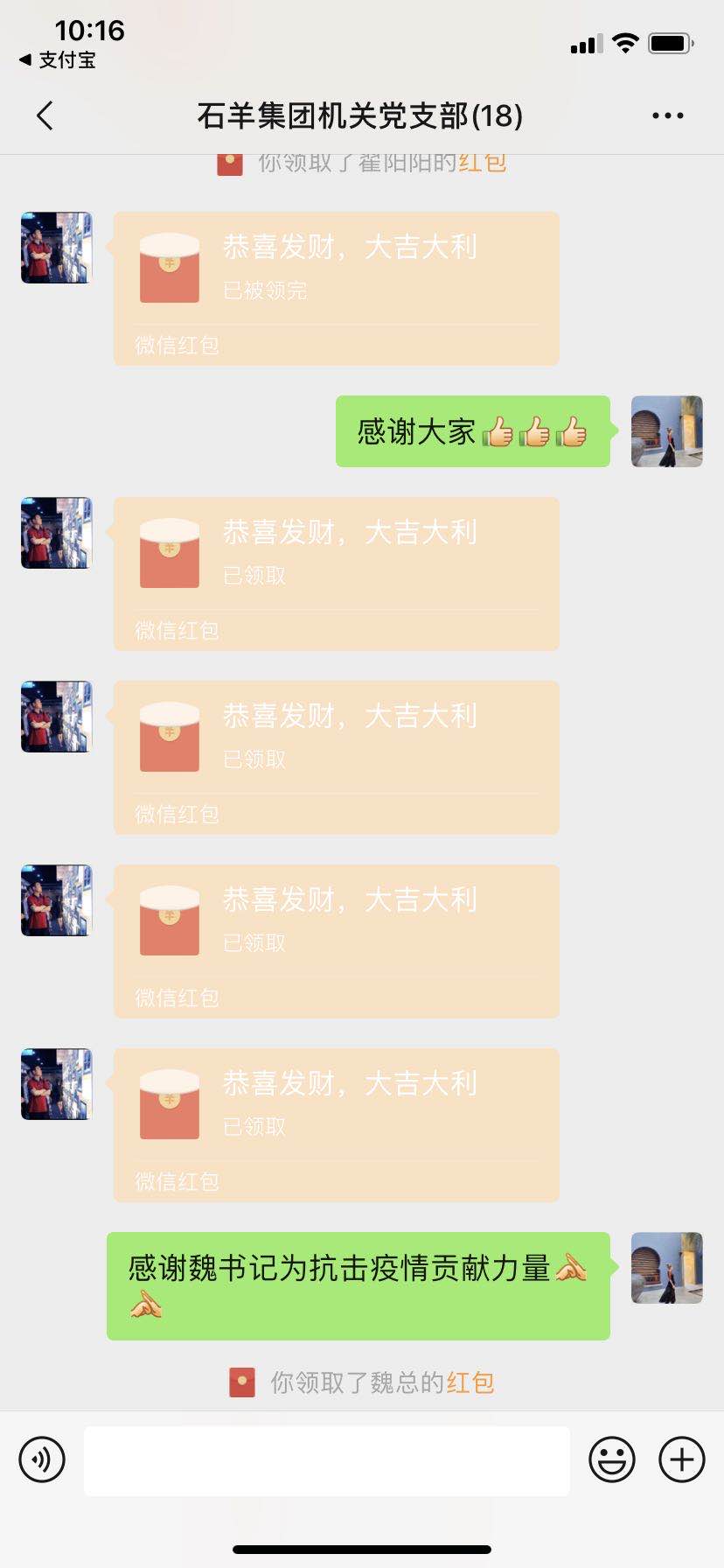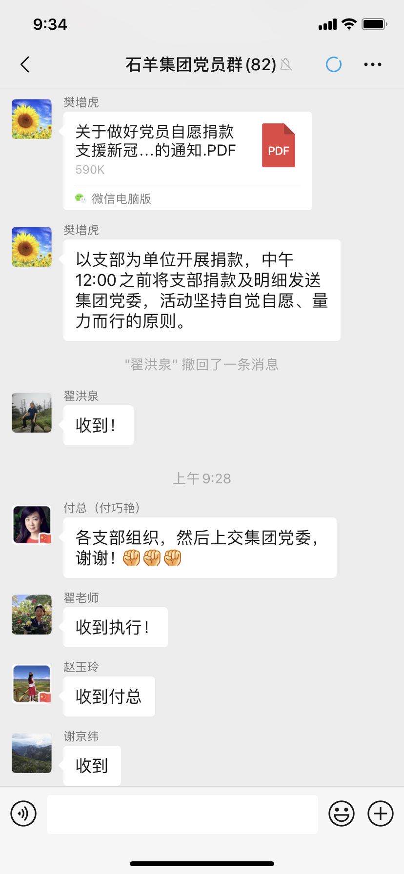 疫情就是命令,防控就是責(zé)任。危難時(shí)刻,共產(chǎn)黨員就應(yīng)該沖鋒在前。2月28日上午,石羊集團(tuán)黨委下發(fā)《關(guān)于做好黨員自愿捐款支援新冠疫情防控工作的通知》,通知發(fā)出后,全體黨員和入黨積極分子踴躍響應(yīng),積極行動(dòng)自愿繳納這份“特殊黨費(fèi)”,為疫情防控貢獻(xiàn)力量,踐行石羊愛心和擔(dān)當(dāng)。