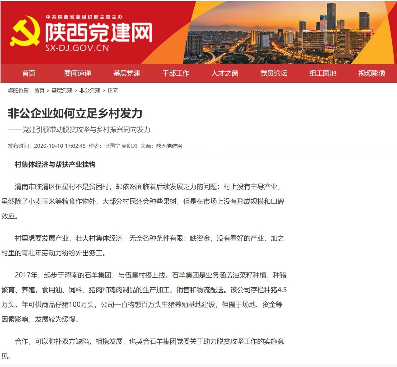 10月11日,陜西黨建網(wǎng)刊登題為《非公企業(yè)如何立足鄉(xiāng)村發(fā)力——黨建引領(lǐng)帶動(dòng)脫貧攻堅(jiān)與鄉(xiāng)村振興同向發(fā)力》報(bào)道。