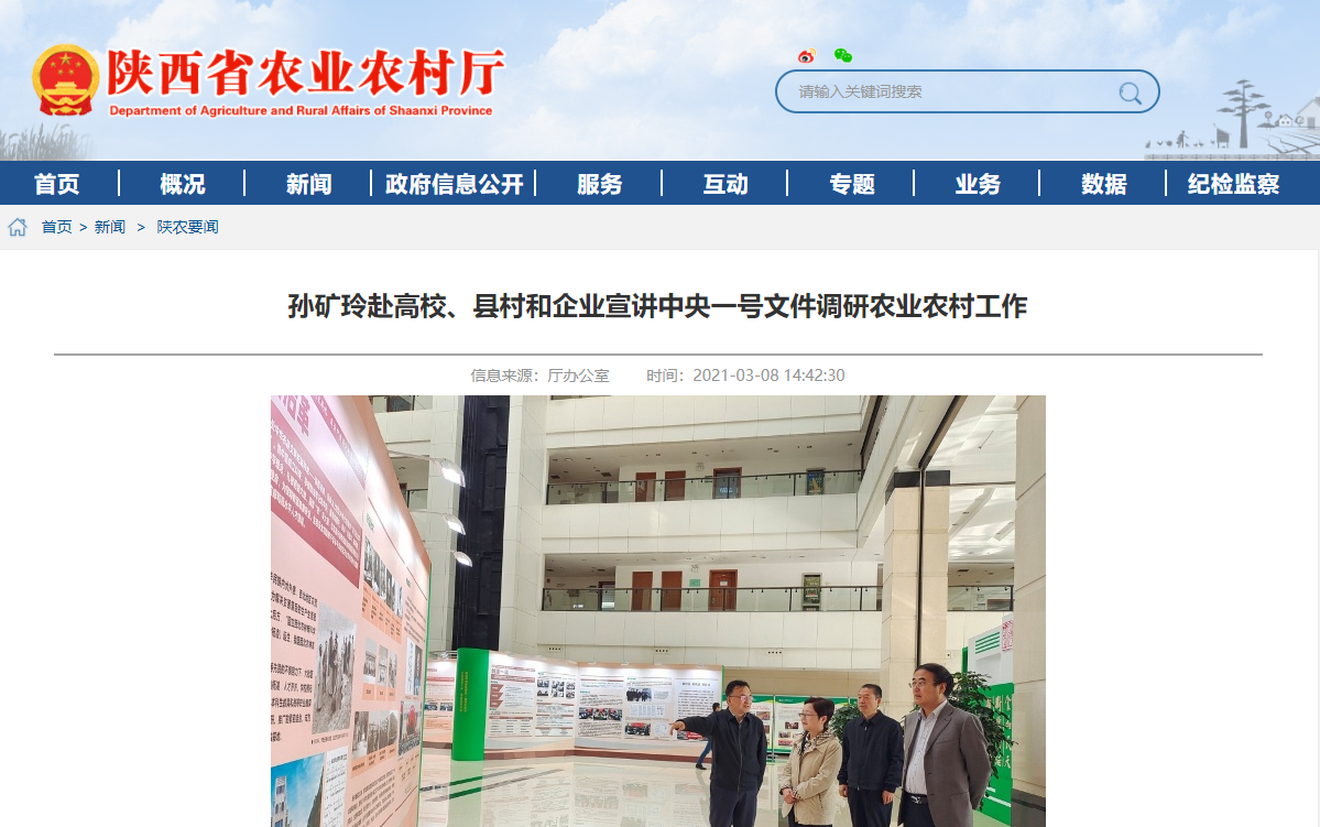 3月3日-5日,省委農辦主任、省農業農村廳廳長孫礦玲先后赴西北農林科技大學、西安市長安區和陜西糧農集團、石羊集團開展“學政策、搞調研、抓落實、促振興”活動,宣講中央一號文件、調研農業農村工作。西北農林科技大學黨委書記李興旺出席有關活動,西安市副市長贠笑冬,省委農辦副主任、省農業農村廳副廳長陳文參加有關調研。