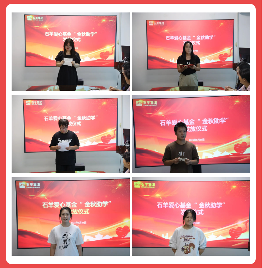 金秋是收獲的季節(jié),也是高校學子的開學季。在莘莘學子即將前往新的征程之際,公司開展“金秋助學”活動,為石羊生態(tài)圈的子女夢想架起愛的橋梁,讓生態(tài)圈更多的人感受到大家庭的溫暖和力量,持續(xù)傳承有愛有溫度的石羊愛心文化。