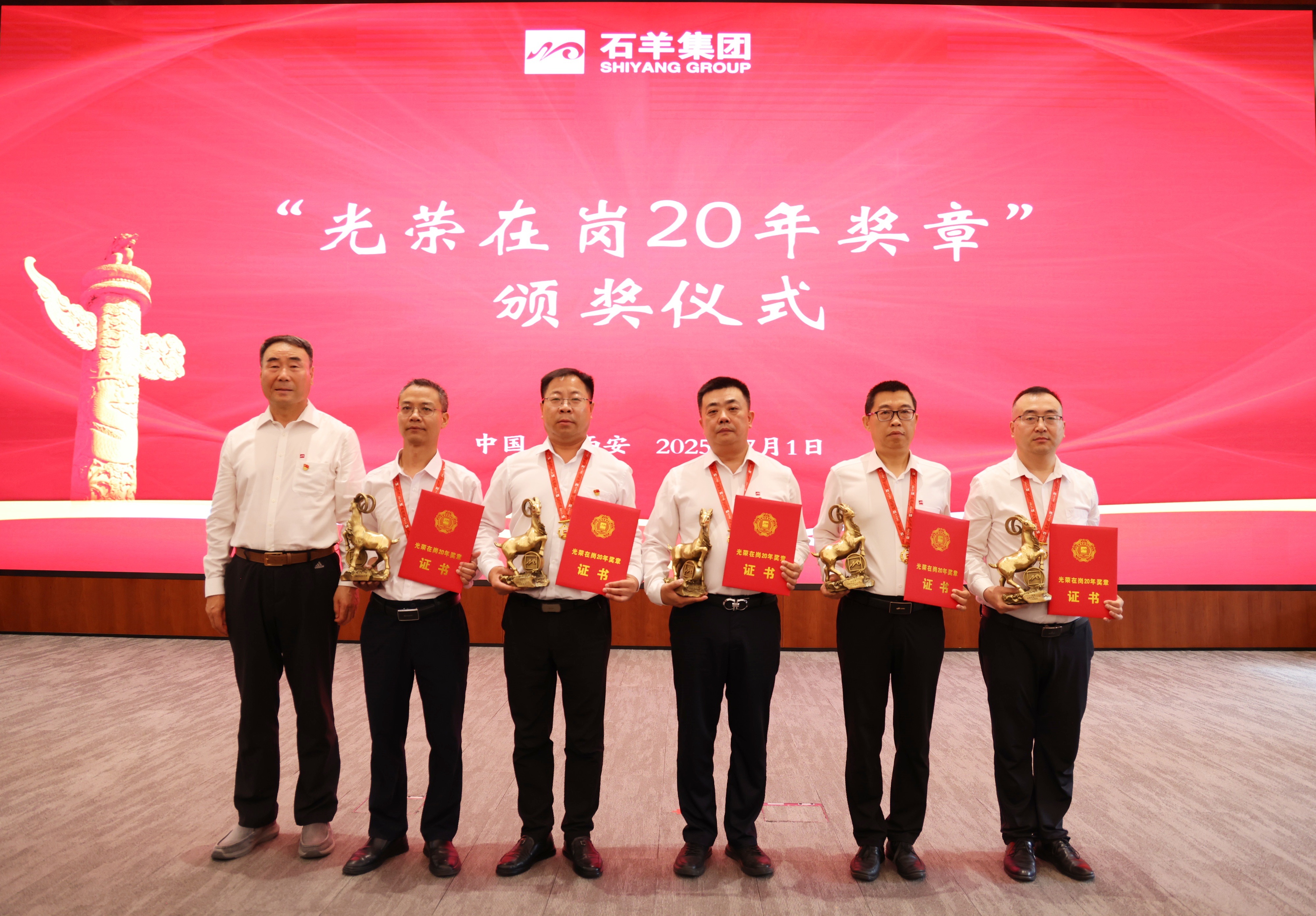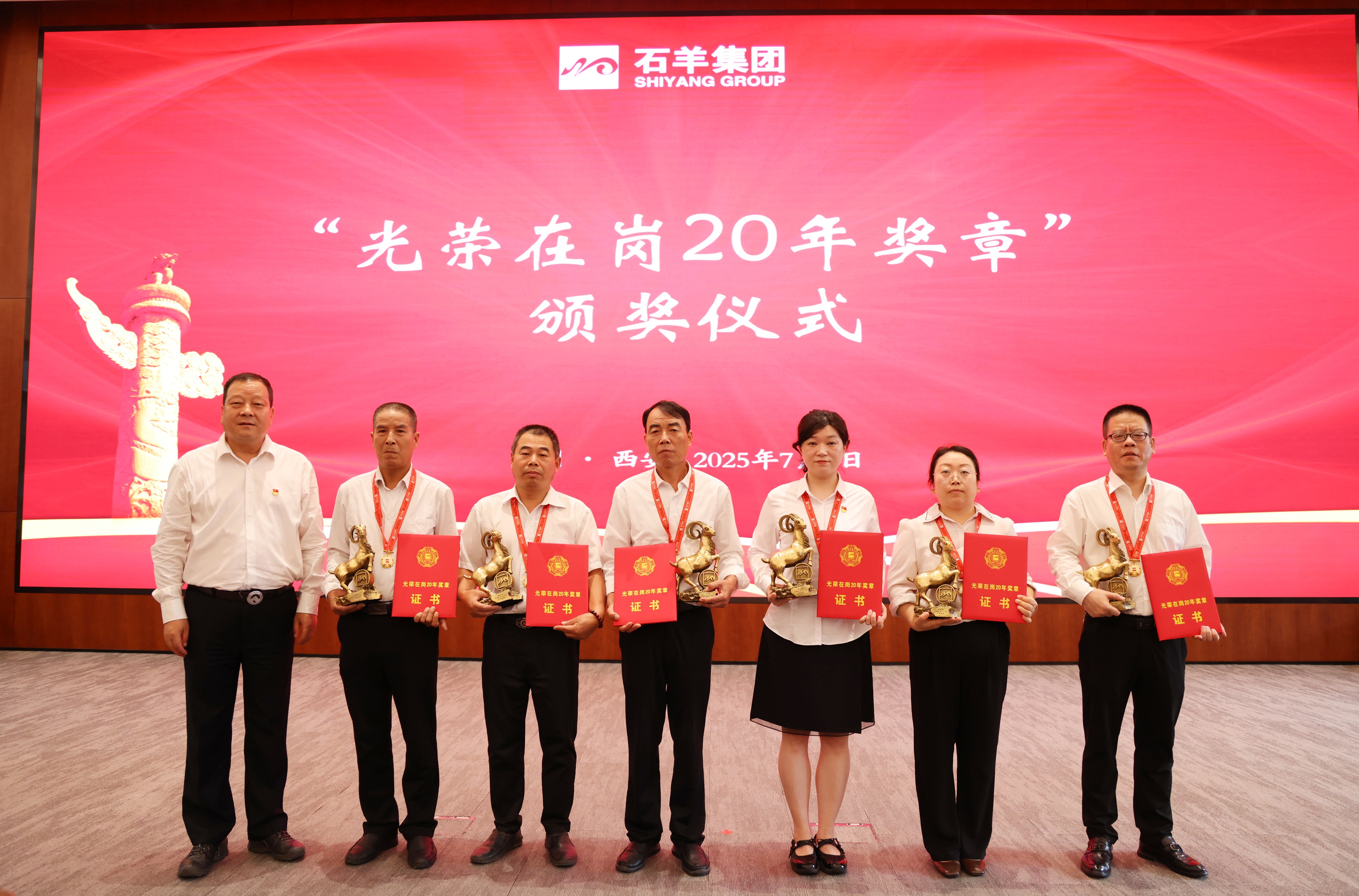接下來,對在崗二十年員工進行表彰,頒發“光榮在崗20年獎章”。20年相伴相隨,石羊人將青春與熱血融入企業發展歷程,在各自崗位上默默耕耘、無私奉獻。當沉甸甸的獎章掛在胸前,閃耀的不僅是榮譽的光芒,更是他們20年如一日堅守與付出的見證,贏得了全場熱烈的掌聲與由衷的敬意。